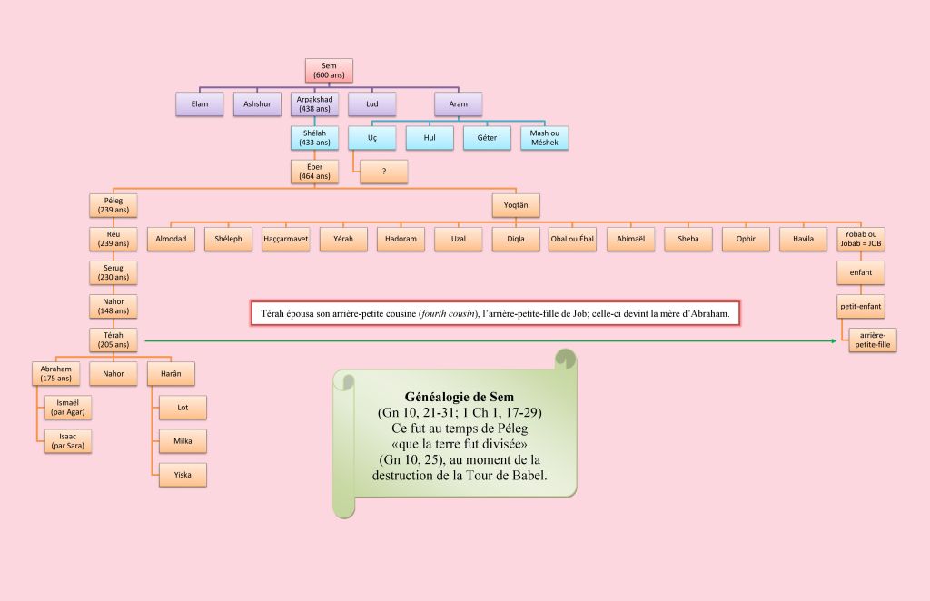 Les exégètes modernes ont tendance à réduire au rang de symboles et de paraboles plusieurs personnages de l’Ancien Testament. Et pourtant, la bienheureuse stigmatisée Anne-Catherine Emmerich nous fournit de précieuses informations sur l’existence de Job (cf. Les Mystères de l’Ancienne Alliance, pp. 122-128). Noé avait 500 ans lorsqu’il engendra ses trois fils Sem, Cham et Japhet (Gn 5, 32). C’est de la descendance de Sem que viendront Abraham, David et notre Seigneur Jésus-Christ. C’est en l’an six cent de la vie de Noé que survint le déluge (Gn 7, 6.11; Gn 8, 13), en l’an 2348 av. J.-C. selon la chronologie de la Vulgate (cf. Raoul Auclair, Mystère de l’Histoire, pp. 40-44, 119-120). Deux ans après le déluge, alors qu’il avait environ 100 ans, Sem engendra Arpakshad (Gn 11, 10). Arpakshad engendra Shélah, Shélah engendra Éber (Gn 10, 24; Gn 11, 13-14; 1 Ch 1, 18; 1 Ch 1, 24-25). C’est le patriarche Éber qui donnera son nom au peuple des Hébreux. Éber eut deux fils: Péleg et Yoqtân. La Bible précise que ce fut au temps de Péleg (Gn 11, 16-19) «que la terre fut divisée» (Gn 10, 25; 1 Ch 1, 19), ce que certaines traditions, confirmées par Anne-Catherine Emmerich, associent à la destruction de la Tour de Babel. Le frère de Péleg, Yoqtân, eut 13 fils, dont le plus jeune serait, selon notre mystique visionnaire, Job. Ce dernier correspondrait donc au Yobab de Gn 10, 29 et 1 Ch 1, 23 (Bible de Jérusalem), que la plupart des versions écrivent Jobab. C’est du côté de Péleg que viendra, quatre générations plus tard, le père d’Abraham, et c’est du côté de Yoqtân que viendra sa mère, présentée par Anne-Catherine comme l’arrière-petite-fille de Job. Ainsi Job fait partie des ancêtres du Messie via le côté maternel d’Abraham.